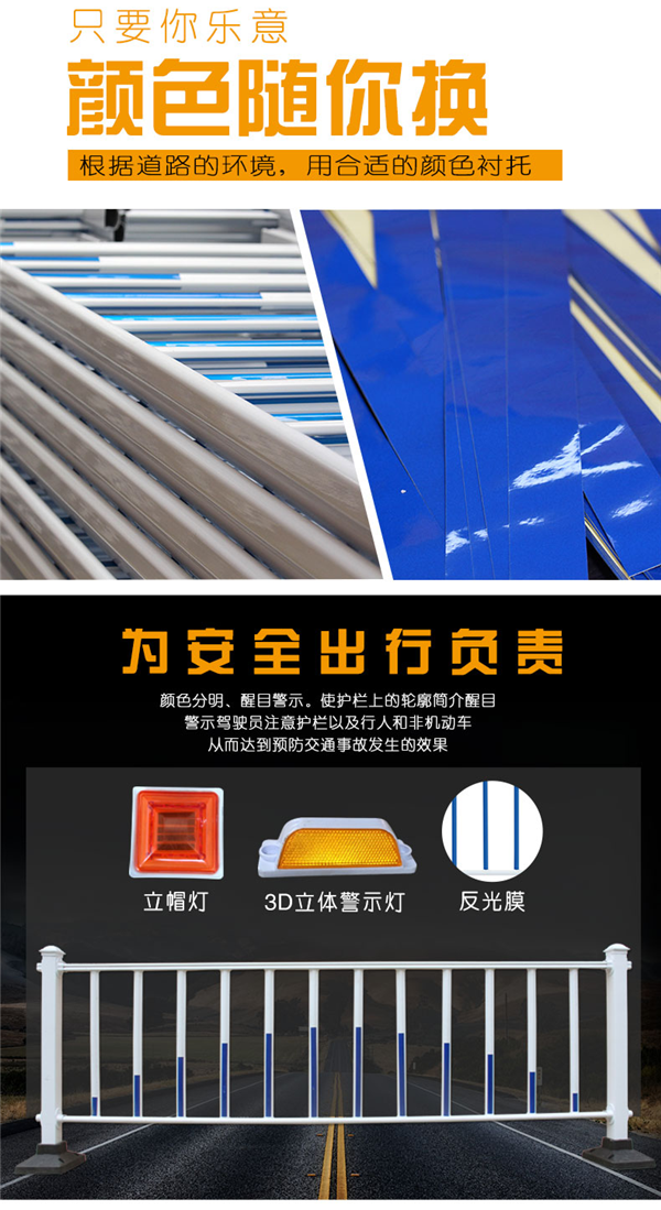 市政護(hù)欄是公路之間的防護(hù)欄,防止行人、車輛不受交通規(guī)則隨便穿越公路而設(shè)置的,為行人和車輛行駛提供安全保障,它美觀新穎,易安裝,安全可靠,價(jià)格優(yōu)惠。市政道路隔離護(hù)欄規(guī)格齊全、品種多,可以任意選擇高度、色彩。適用城市交通要道、高速公路中間綠化隔離帶、橋梁、二級公路、鄉(xiāng)鎮(zhèn)公路及各公路收費(fèi)口等的隔離