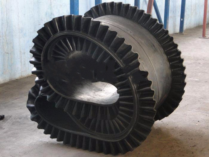 常見的擋邊輸送帶為大傾角波狀擋邊輸送帶,大傾角波狀擋邊輸送帶由基帶、擋邊、橫隔板3部分組成。擋邊起防止物料測滑撒落的作用。為便于繞過滾筒,檔邊設計成波紋狀;橫隔板的作用是承托物料,為了實現(xiàn)大傾角輸送,采用T型TC型。檔邊和橫隔板是用二次硫化的方法與基帶連接的,具有很高的連接強度。